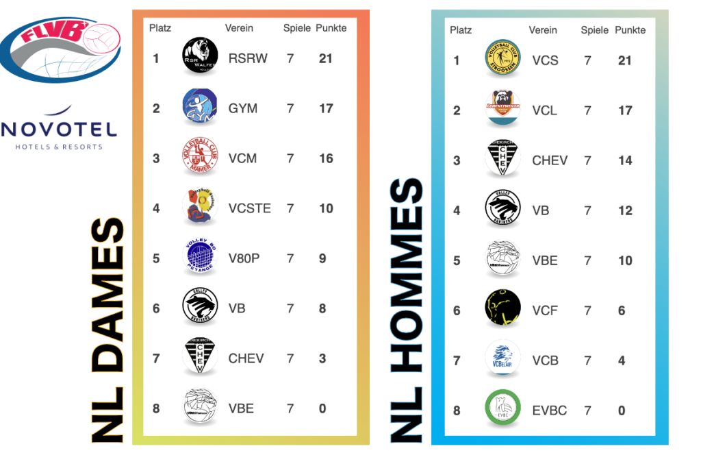 Bäi den Hären huet Stroossen bis ewell 2 Sätz ofginn ma steet awer alleng un der Spëtzt vun der Tabell. Direkt hannendru kënnt de Vc Luerentzweiler op der 2ter, de CHEV Dikrech op der 3ter an de Supercup Gewënner Volley Bartreng, déi sech dëse Weekend am direkten Duell mam Volleyball Iechternach en 2 Punkte Virsprong op de Play-down erausgespillt hunn. Hannert der Iwweraschungsekipp Iechternach op der 5ter Plaz kommen de Vc Fenténg, de VC Belair a bis ewell nach ouni Punkt, den Escher Volleyball Club.