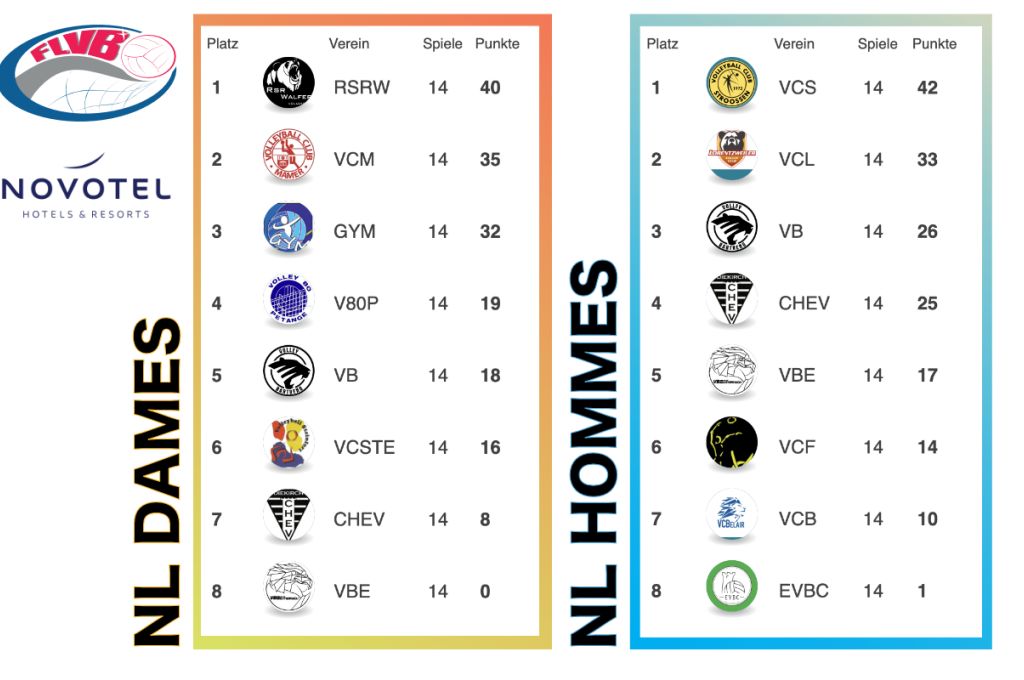 An der Novotel Ligue vun den Hären bleift de VC Stroossen och am 14te Match ongeschloen an zitt mam Maximum vun 42 Punkten als Leader an d' Halleffinallen. Hei spillt de Champion en titre géint de CHEV Diekirch, déi sech gëschter iwweraschend géint de VC Fenténg huet misse geschloe ginn. An där anerer Halleffinall treffen den VC Luerenzweiler op de Volley Bartreng.
