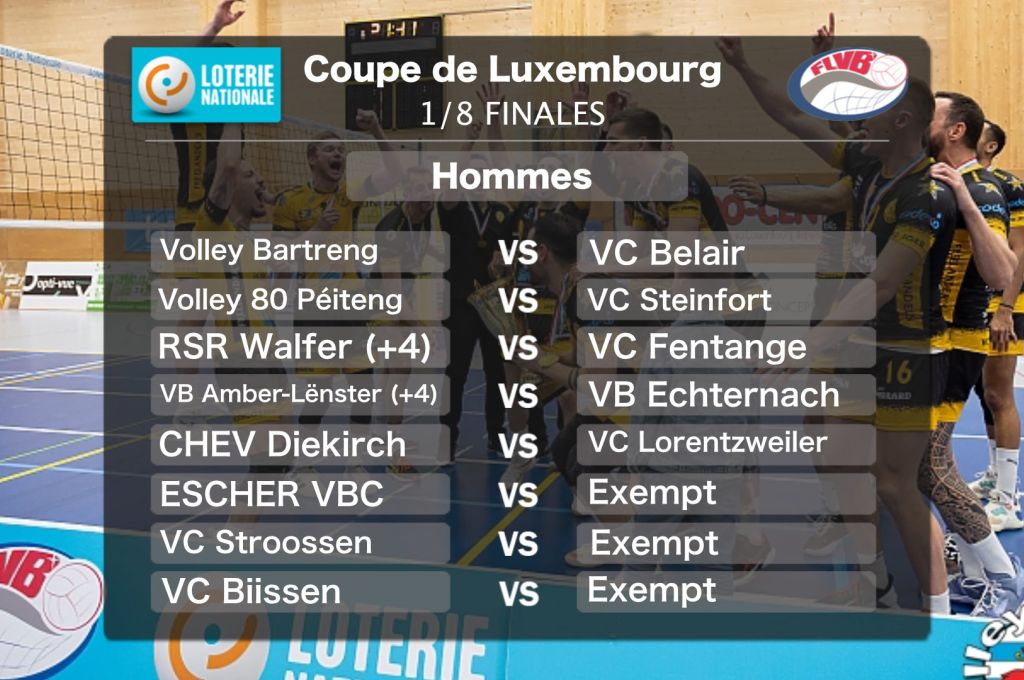 Am éischten Tour vun der Loterie Nationale Coupe de Luxembourg bäi den Hären kënnt et zu engem ganz intressanten Duell tëschent zwou Ekippen aus der Novotel Ligue. Hei kann de CHEV Diekirch op den Heemvirdeel géint de VC Luerenzweiler zielen. Och den Derby tëscht dem VB Amber-Lënster an dem VB Echternach stécht eraus. Anecht wéi nach am Barragematch 2022 kann Amber-Lënster dës Kéier vu 4 Punkte Virsprong pro Saz profitéieren. Wéi bäi den Dammen gouf och bäi den Hären e Fräilous fir de Coupeverdeedeger, VC Stroossen, gezunn.
